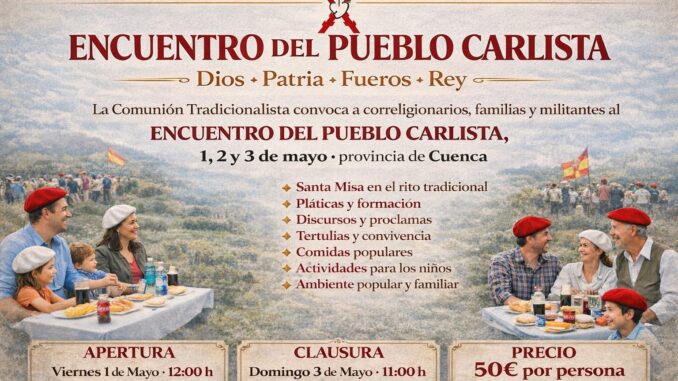 La Comunió Tradicionalista convoca una «Trobada del poble carlí» per als dies 1, 2 i 3 de maig a la província de Cuenca. Es tracta d’una convocatòria dirigida a tots els correligionaris de la Península (i més enllà) per a enfortir els vincles, reafirmació en els ensenyaments tradicionals i per aumentar el compromis de la militància legitimista.